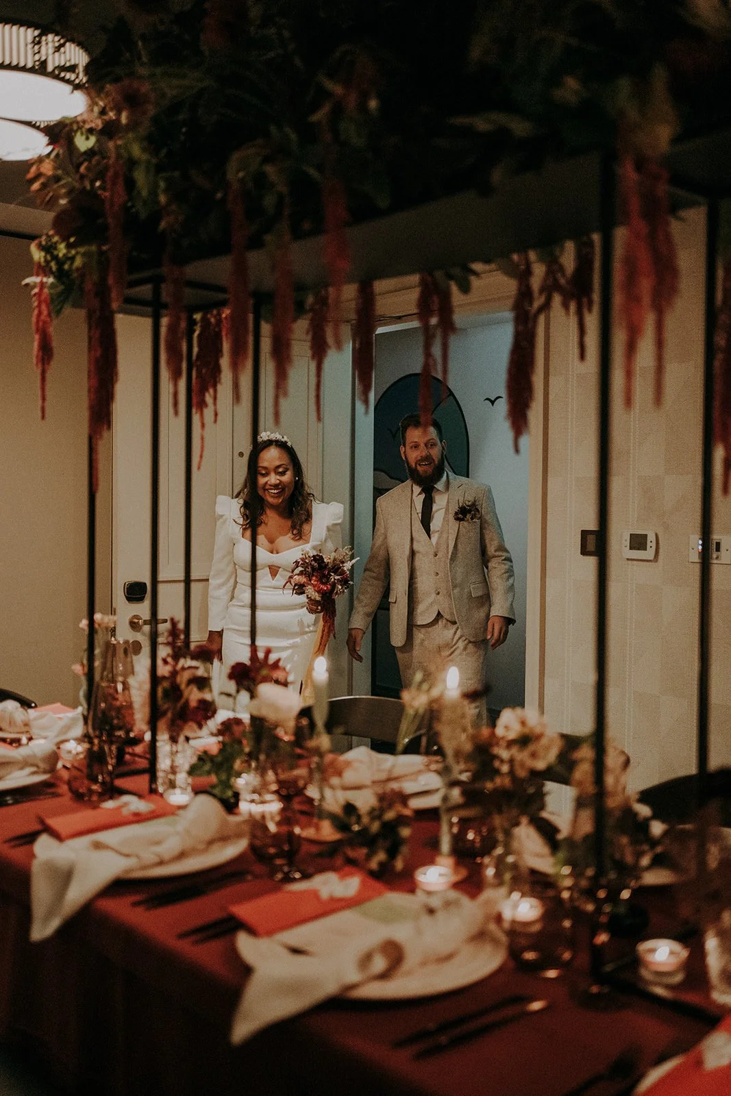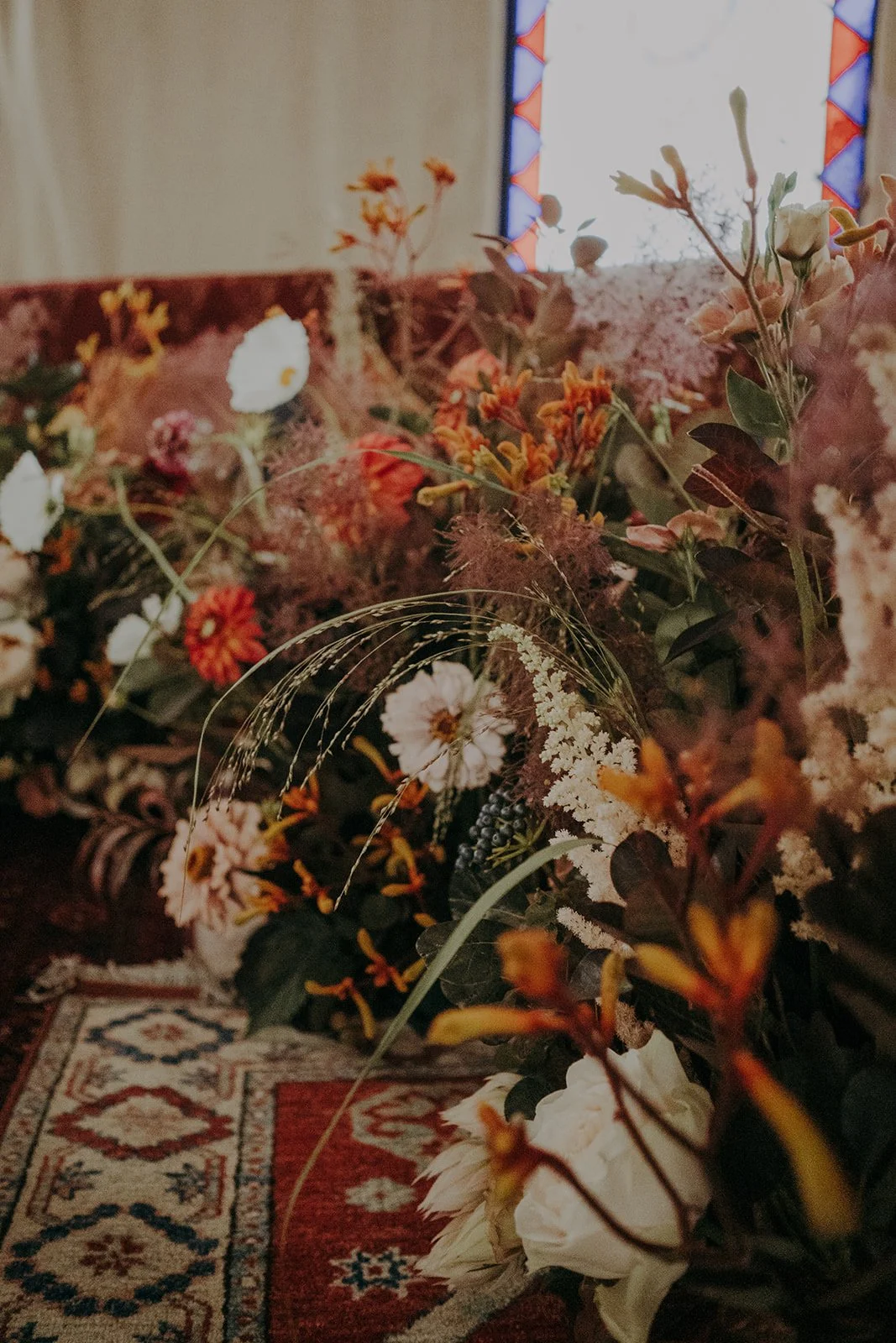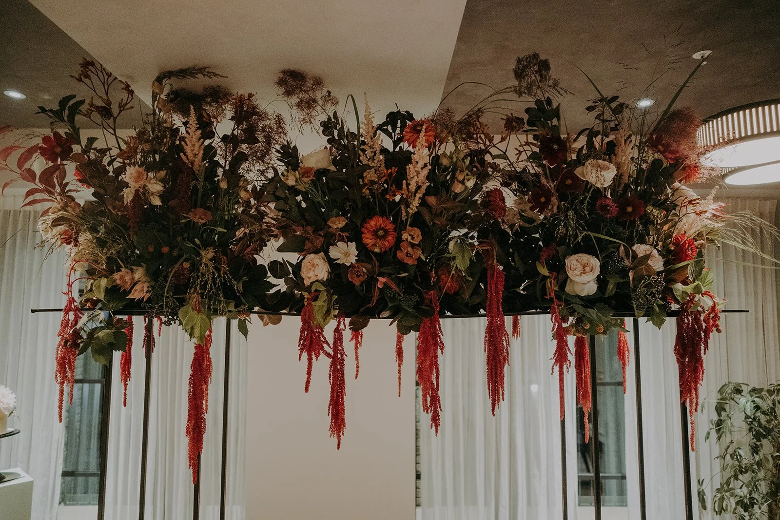Normala & David planned a thoroughly unique celebration, and dreamed of opulent and original floral design to match their London elopement. To complement their intimate ceremony at The Bedouin Tent at St Ethelburgas, we created an abundant meadow of jewel toned seasonal blooms. Following the ceremony, we moved the blooms across to the Hoxton Hotel, repurposing the arrangement with the addition of trailing Amaranthus to create a gorgeously opulent table scape. An elevated meadow added texture, ambiance and an impressive setting for guests.