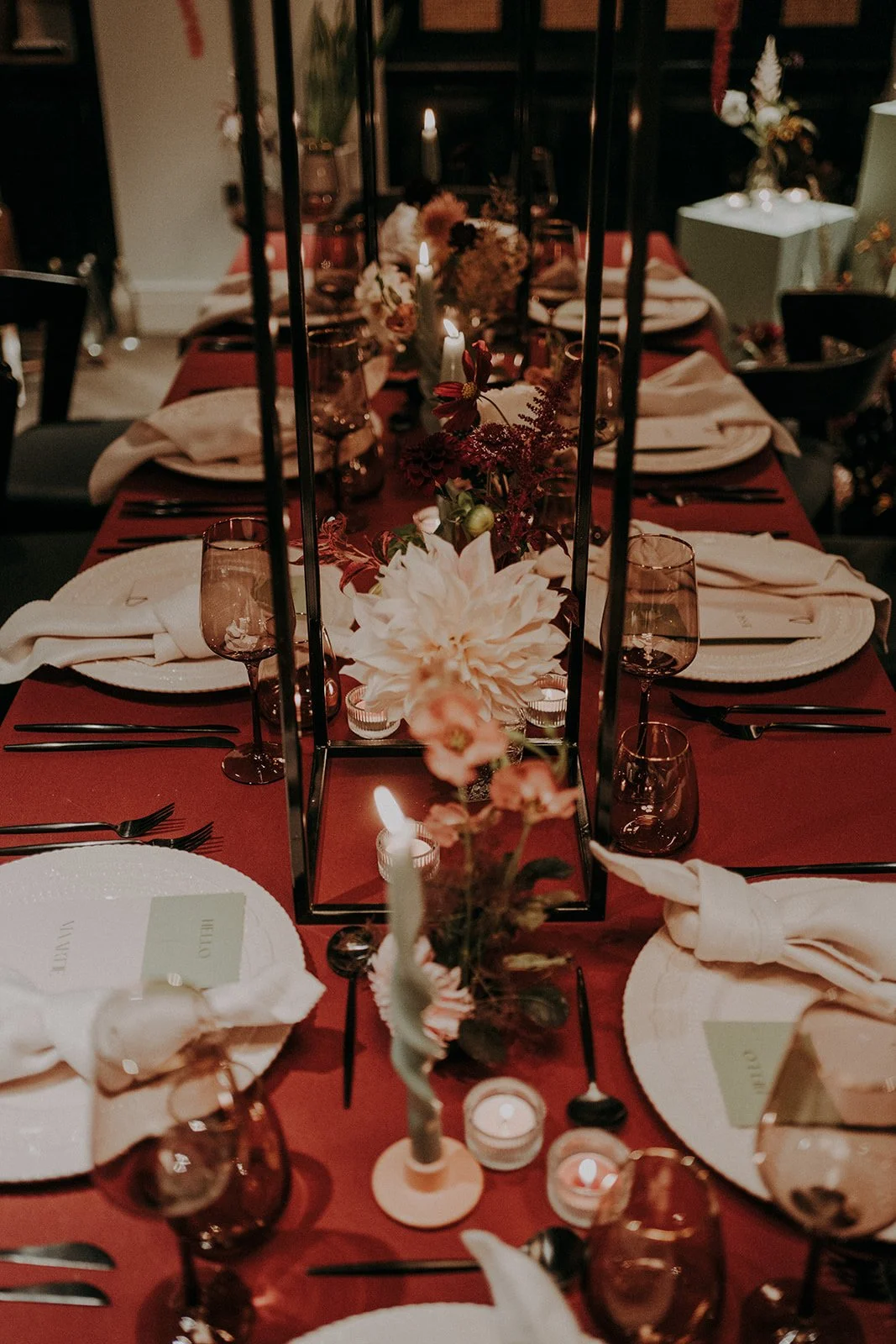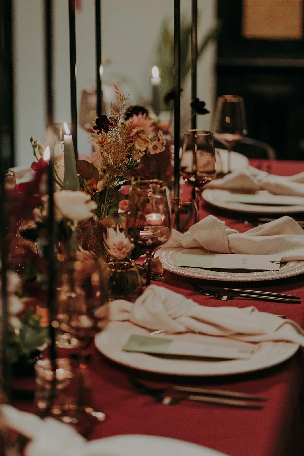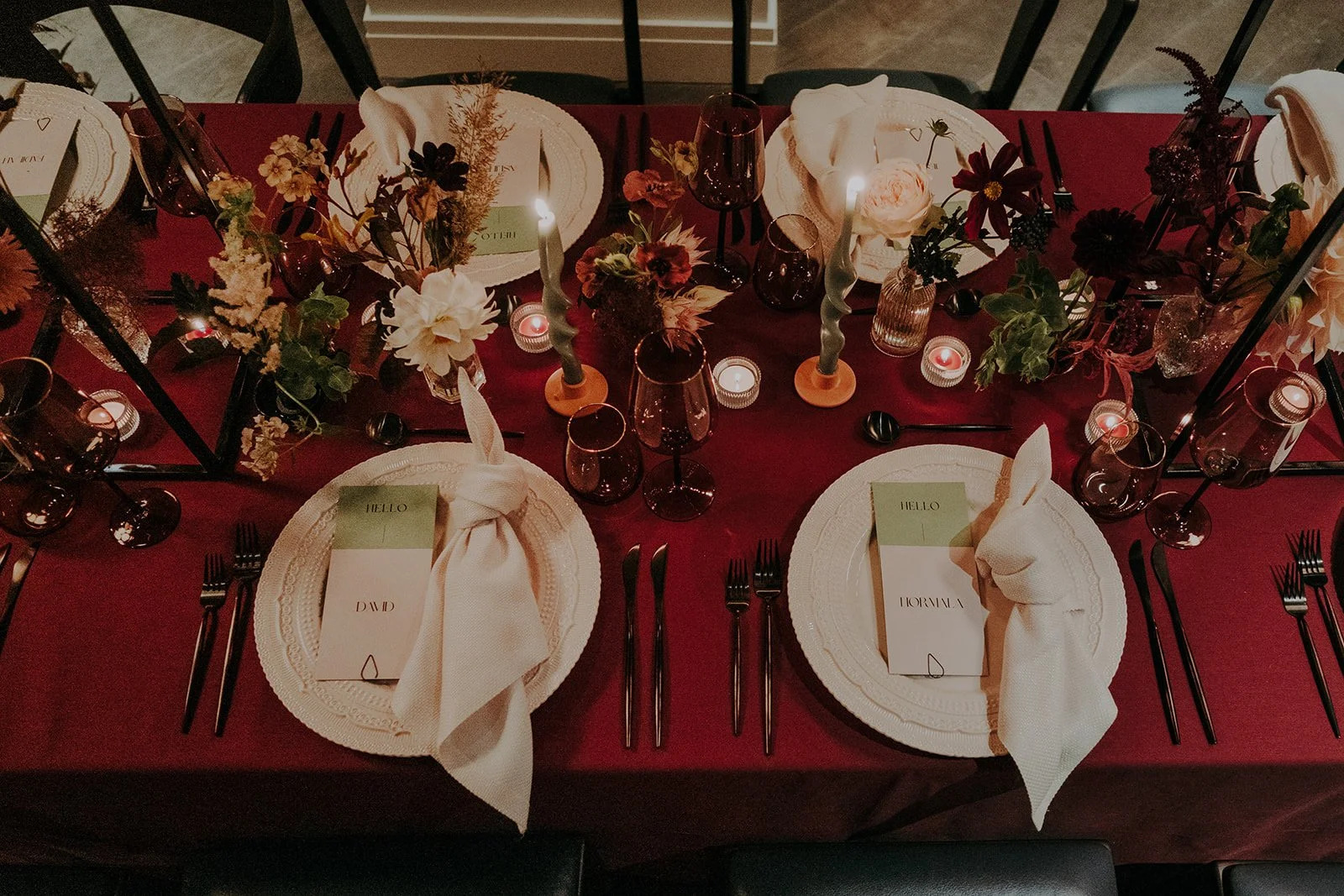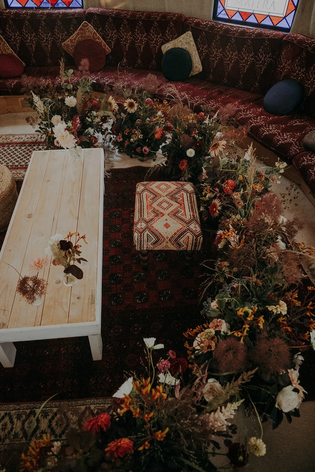 Normala & David planned a thoroughly unique celebration, and dreamed of opulent and original floral design to match their London elopement. To complement their intimate ceremony at The Bedouin Tent at St Ethelburgas, we created an abundant meadow of jewel toned seasonal blooms. Following the ceremony, we moved the blooms across to the Hoxton Hotel, repurposing the arrangement with the addition of trailing Amaranthus to create a gorgeously opulent table scape. An elevated meadow added texture, ambiance and an impressive setting for guests.